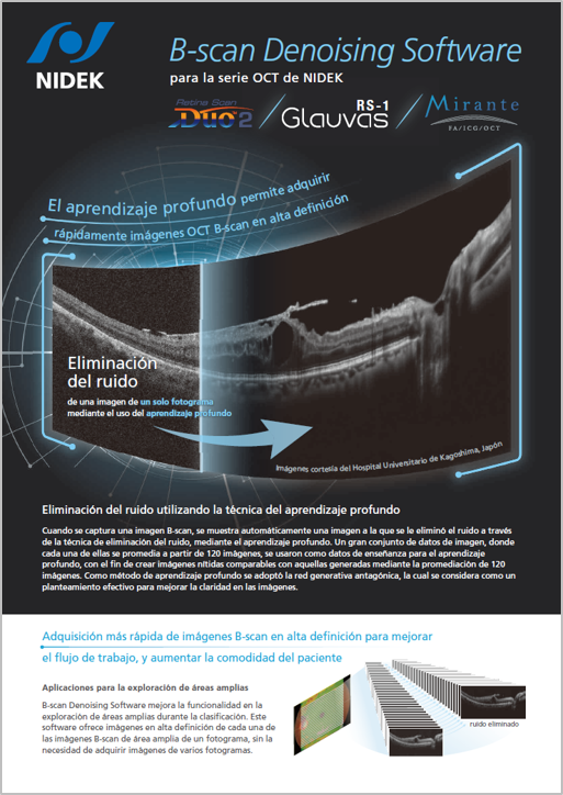 The B-scan Denoising Software removes speckle noise from a single scan, producing an image that is as clear as an image generated by averaging 120 images. The denoising technique allows easier image acquisition for obtaining high quality images.
