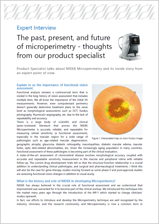Most of the clinical applications of Microperimetry are well known and the results supersede the most common functional tests such as Visual Acuity or Visual Field. In my practice, the NIDEK MP-3 is the optimal device for visual rehabilitation. We use this device to understand the functionality of the residual retinal sensitivity, modifications to the cloud of fixation, and to localize the Preferred Retinal Location (PRL) that often occurs after clinical damage. If the combined outcomes of these tests indicate decreased functional vision, then we can use the Biofeedback training available in MP-3 to change the PRL location. A Training Retinal Location (TRL) allows better visual performance for reading and common daily tasks. Additionally, this strategy frequently results in decreasing the magnification power required by the patient, resulting in use of more friendly visual aids. The latest use of this application is to improve performance among athletes. Training the normal fovea to increase speed of fixation saccades is very useful in sports involving fast moving targets or team players (eg. volleyball, shooting, race-car drivers, etc.).