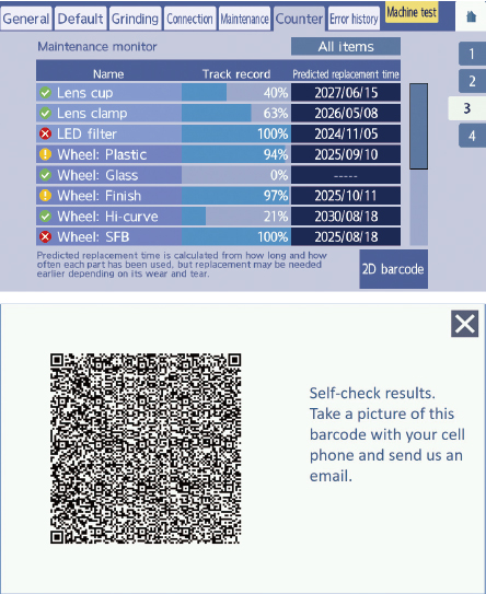 The self-check function automatically diagnoses selected components during a malfunction. Results are displayed as a 2D barcode, which can be sent to an authorized distributor for fast service support.